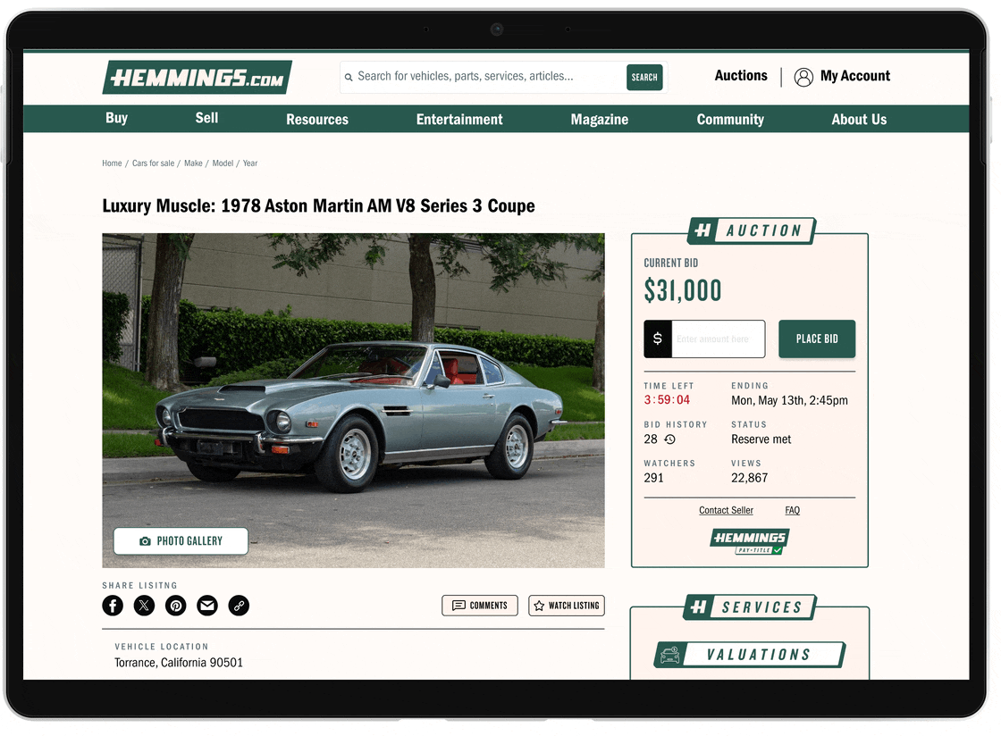 The Auction Vehicle Detail Page is a critical part of Hemmings' platform, enabling users to engage with vehicle auctions. This redesign aimed to enhance usability, increase visibility of key actions, and streamline the page structure across all devices. The goal was to improve user satisfaction, drive conversions, and create a visually cohesive experience.