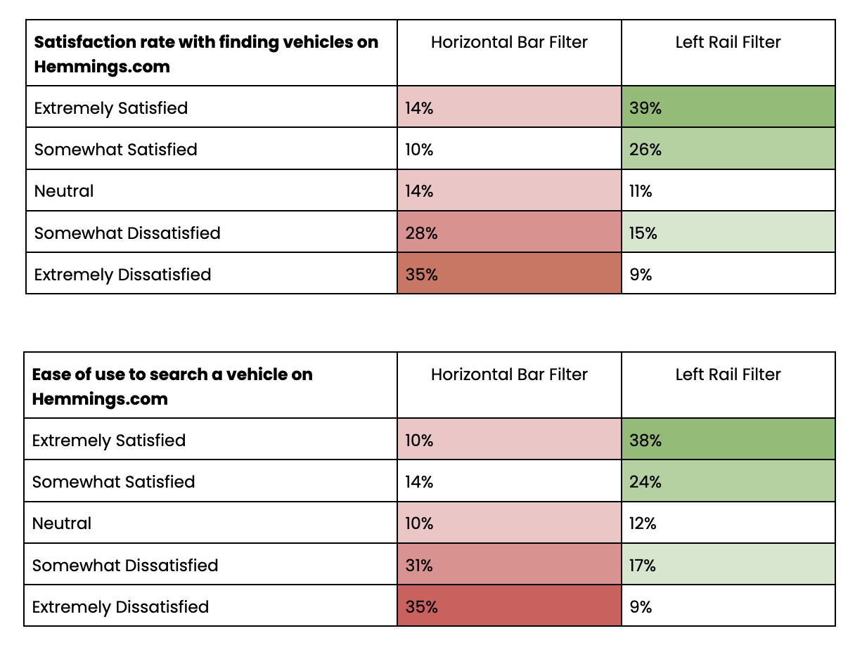 Users preferred the old format, where they could begin searches with broader categories (e.g., by decade) and eliminate auction vehicles more easily.